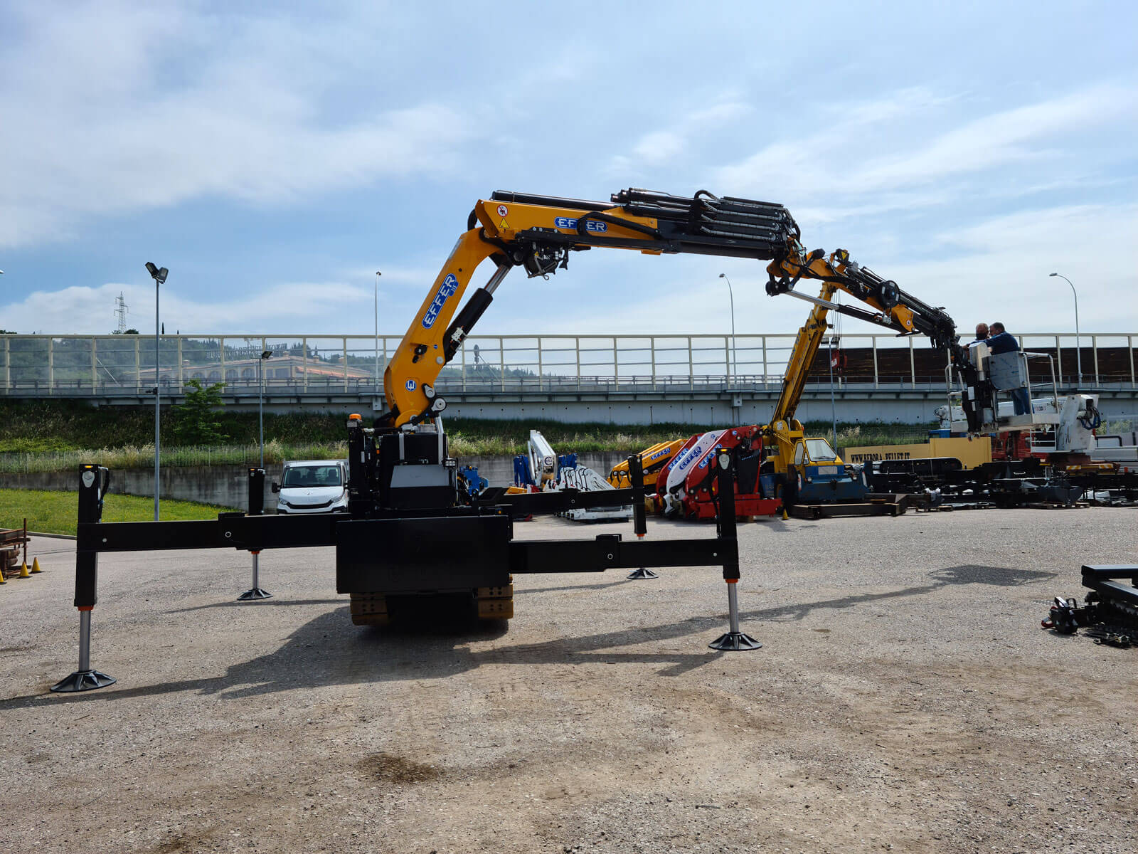 The outriggers of CWE 315 Range, Provided With Cross Beams System, confer to the Crane Chassis an incomparable torsion resistance always keeping extremely Compact the machine Dimensions in rest position.The outriggers cylinders, solid with extended stroke, Simplify the Crane Endurance on strongly steep grounds.