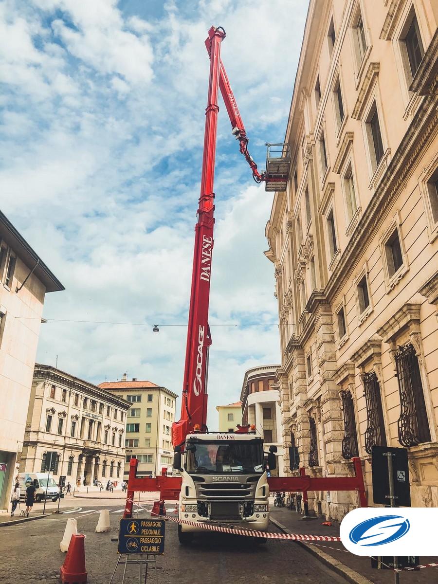 Dimensiunea coșului de aluminiu este de 2300 x 900 x h 1100 mm, extinzându-se hidraulic la 3600 mm pentru a mări spațiul de lucru. Rotirea coșului este de 360° (180° stânga + 180° dreapta) permițând o mare versatilitate de poziționare pentru muncă, chiar și sub un pod